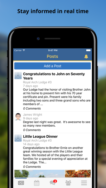 คุณสามารถทำความเข้าใจข่าวสารจากโพสต์ทั้งหมดของโลจของคุณได้โดยการดูฟีด ทำให้คุณไม่พลาดข่าวสารสำคัญ นอกจากนี้ แอปพลิเคชันยังให้รายการกิจกรรมที่กำลังจะเกิดขึ้นในโลจของคุณทั้งหมด โลจใกล้เคียง และเขตอำนาจ ทำให้คุณสามารถวางแผนและยืนยันการเข้าร่วมประชุมได้อย่างง่ายดาย